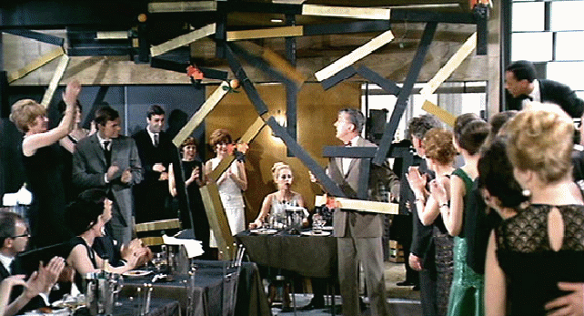 Tati est plutôt un poète, un rêveur, donc les formes que prend la fête sont différentes (il y a chez lui, comme je l’ai dit plus haut, un côté involontaire dans son déclanchement) mais, au bout du compte, les préoccupations sont les mêmes. Le sens véritable de la fête a à voir avec ce monde de l’enfance ; non pas, qu’il faille regretter cette période, mais lorsque l’individu s’amuse et rit, il devient tel un enfant, aussi anarchique et incontrôlable. Quand l’être humain s’amuse et ce, même dans un monde où tout semble a priori l’en empêcher, alors la vie qui s’en dégage, ce bonheur que l’on ressent, cette simplicité dans l’amusement s’associent à la décomposition de ce qui avait rendu ce monde inhumain. Le coup de pied a été porté dans la fourmilière : la hiérarchie, l’organisation sociale, l’architecture aseptisée, la gadgétisation du monde, tout vole en éclats. Certes pour un moment seulement, le temps de la fête, le temps pour l’individu de se libérer de lui-même, de voir le monde comme un monde à l’envers.