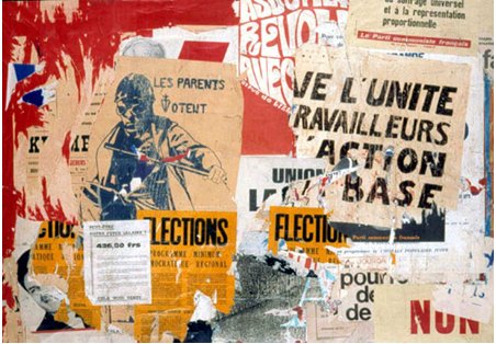 Ainsi Jacques Villeglé et sa collection d'affiches lacérées prélevées directement sur les murs des villes et transposées artistiquement sur ceux des espaces d'exposition, des galeries. Mais jamais il ne s'agira de l'affiche originelle, soigneusement composée, subtilement ouverte à l'iconographie commerciale et matérialiste. Pas plus que du média abouti visant à conditionner le consommateur, à l'amener à renoncer à tout libre arbitre afin que, libéré de ses retenues, de ses a priori, il puisse se livrer à une nouvelle sacramentalité au centre de laquelle trônera, comme sur un piédestal, l'objet élu, désiré, sanctifié.